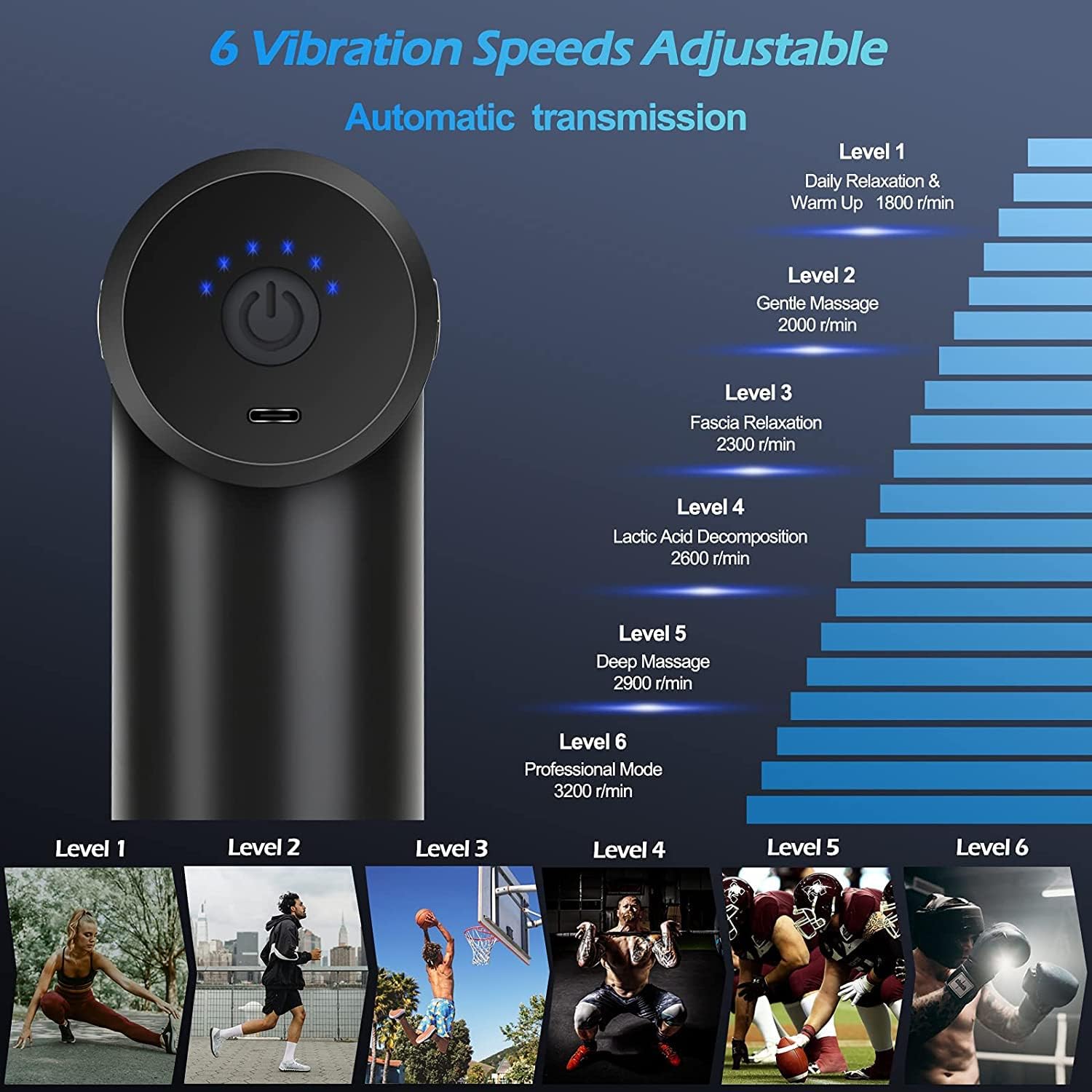 ⚙️ 6 Speed Levels + 4 Massage Heads – Comes with 4 different heads for all muscle groups and adjustable speeds (1800–3200 RPM) to match your massage needs.
